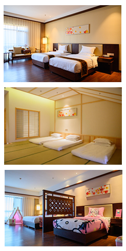 酒店總建筑面積30000多平方米,主樓高6層,設(shè)有150余間標準客房、家庭客房、日式客房和別墅客房。房內(nèi)設(shè)計新穎別致,充分考慮家庭度假需求,最小房型面積在50平米以上。